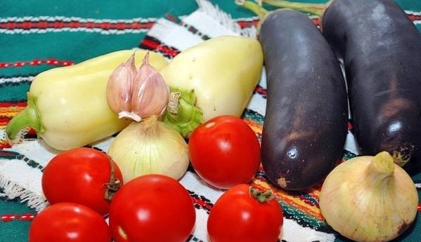 A continuación, comienzan a preparar la berenjena. Como todas las demás verduras, se lavan con agua corriente. Después de eso, los tallos se cortan de la fruta y se cortan en cubos o rodajas. No importa el tamaño de las piezas. Pelar la cebolla y cortarla en mitades. Y el ajo se puede triturar simplemente con una prensa o picar finamente con un cuchillo.