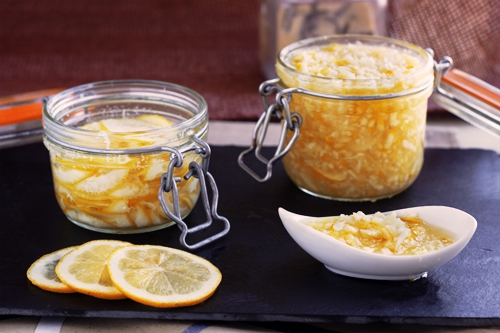 Los cítricos retorcidos son una forma de hacer un limón con azúcar. Picada con una picadora de carne o con cuchillos para licuadora, la fruta es adecuada para su almacenamiento en frascos pequeños.