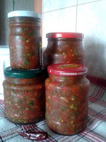 Pelar los ajos y ambos tipos de pimientos, también molerlos con una picadora de carne. Hacemos lo mismo con los tomates. Mezclamos todas las verduras, agregamos sal, azúcar, sazonamos con vinagre al gusto y empacamos en frascos secos estériles. Pueden cubrirse con fundas de plástico. Esta adjika de perejil debe conservarse en el frigorífico.