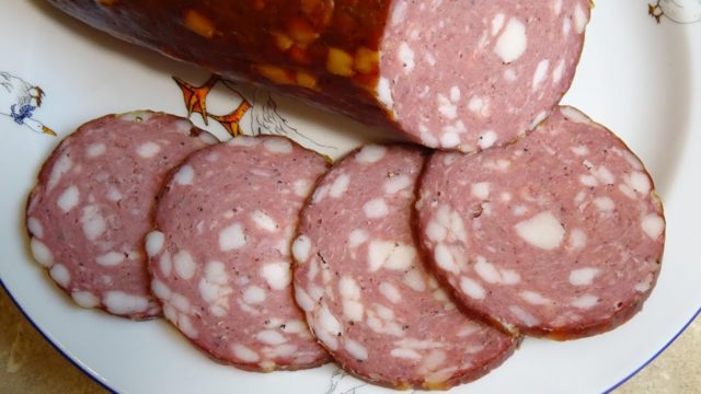 - Seque la salchicha en un ahumadero durante cuatro horas a una temperatura de 50 grados. Luego ponga el producto en el frigorífico durante la noche.