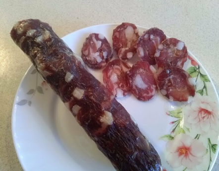 - Llenar bien la carcasa con la masa. Su diámetro es de unos 4,5 cm. Utilice una jeringa para salchichas o una picadora de carne para el relleno. Pon los productos en el frigorífico durante una semana.