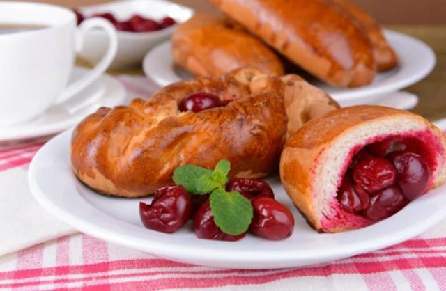 Después de eso, lo único que queda es moldear los pasteles de la masa tierna que ha subido, poner rellenos en cada uno y enviarlos al horno a 180 grados durante 40 minutos. Aunque los pasteles de cereza son ricos en calorías, en pequeñas cantidades no serán dañinos para la diabetes.