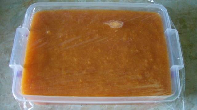 Para el puré de albaricoque, use tazas en porciones. Inmediatamente después del llenado, el recipiente se coloca en el congelador. Durante el almacenamiento, los vasos con puré de papas se cierran con tapas o se tira de una bolsa de plástico.