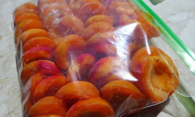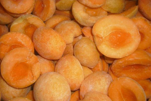 El proceso comienza con la recolección de frutos maduros y duros. Los albaricoques se lavan bien, se secan sobre un paño, se cortan por la mitad y se deshuesan. Las mitades se colocan en una capa en una bandeja. Se puede rociar con una solución de jugo de limón y agua. La bandeja se coloca en el congelador, se enciende a la temperatura más baja posible. Después de congelar, las rodajas se empaquetan en contenedores y se envían para su almacenamiento a largo plazo.