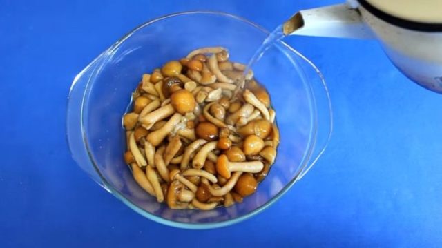 Las setas también se colocan en agua durante media hora antes de salar o encurtir. Los hongos con miel se volverán livianos cuando se remojen, si agrega un poco de vinagre al agua.