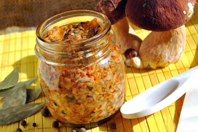- Esterilice el frasco, llénelo con champiñones, hierbas, llenando cada capa con sal.