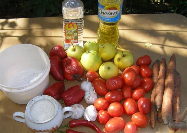 Cocinar tal adjika no lleva mucho tiempo, que es su principal ventaja. El primer paso es lavar y pelar todas las verduras. Los tomates se pueden sumergir en agua hirviendo y pelar. Pero también puedes perderte este momento, ya que después de moler prácticamente no se siente. Retire el tallo y el corazón del pimiento, triture bien todas las semillas. Corta las manzanas en 4 trozos y también quita los corazones. Puedes dejar la piel de las manzanas. Limpiamos y lavamos las zanahorias con agua corriente.