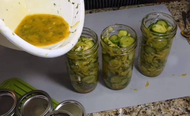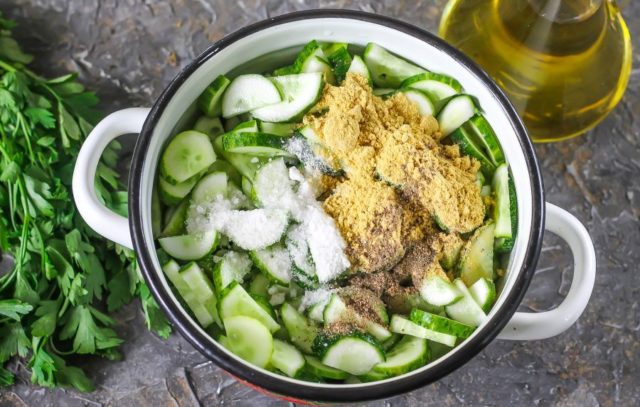 - Debe cortar los pepinos en rodajas finas, dejarlos escurrir y, en este momento, hacer una marinada. Para hacer esto, combine el azúcar, el aceite, la sal, la mostaza y el vinagre, agregue el ajo.
