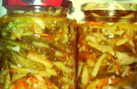 - Este relleno se mezcla con pepinos, el plato se coloca en recipientes de vidrio estériles y se enrolla para el invierno.