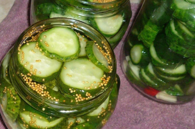Esta receta de ensalada de pepinos con mostaza para el invierno es algo diferente a las demás. Para cocinar, debe cortar las verduras, mezclarlas y colocarlas en frascos, dejando 2-3 cm del borde.