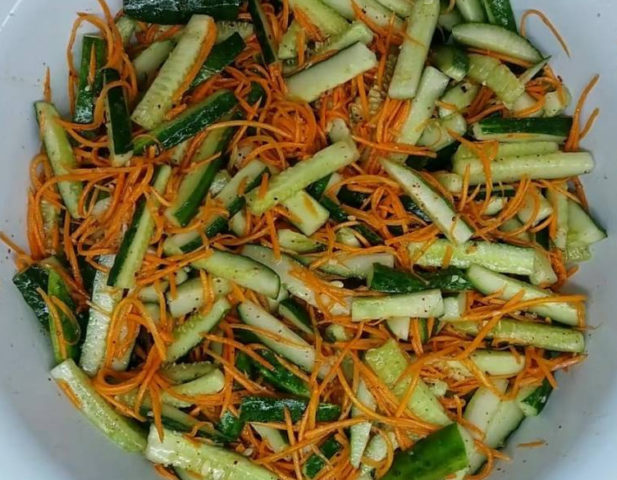 Para la ensalada, las zanahorias se cortan en un rallador y los pepinos se cortan con un cuchillo para que no quede una masa blanda.