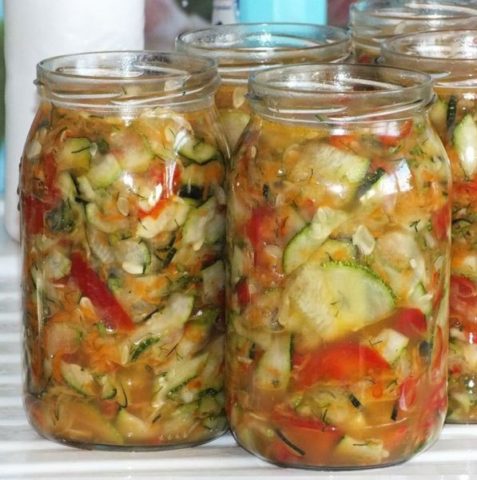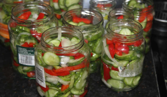 - Cuando las verduras sueltan el líquido, la merienda se coloca en frascos. De antemano, el recipiente debe lavarse a fondo con un antiséptico. La ensalada se puede cerrar con una tapa de nailon o se pueden utilizar tapas de hierro.