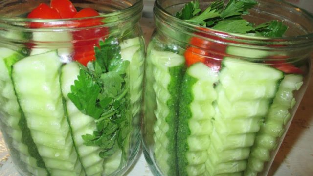 Los recipientes de vidrio y las tapas para conservas durante el invierno deben esterilizarse. Los recipientes se eligen para que la ensalada abierta se coma de inmediato. Los bancos deben enjuagarse minuciosamente, sin el uso de agentes limpiadores ni sustancias jabonosas, excepto soda o mostaza en polvo. Luego colóquelo en un baño de agua, vapor u horno y cocine al vapor durante 20 minutos. Las tapas de estaño se pueden hervir durante al menos 10 minutos. Coloque los recipientes terminados cuidadosamente sobre toallas, cubra con tapas para que no entre nada. O sacar uno a la vez del agua o del horno, rellenar con ensalada.