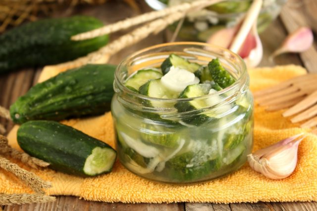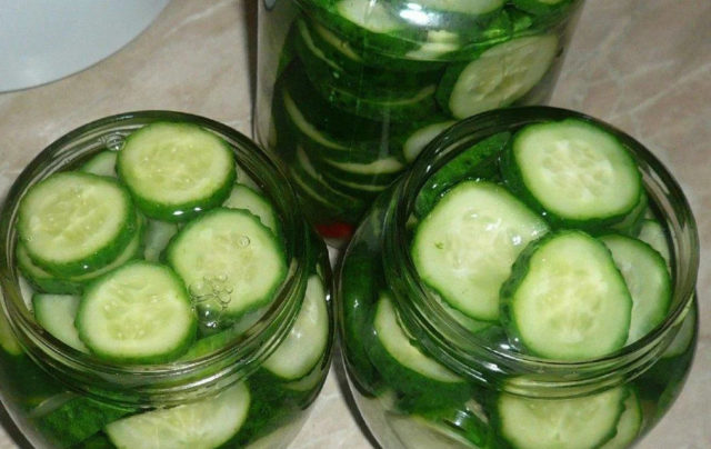 Es necesario prelavar los frascos con un antiséptico y luego secarlos. En el fondo del recipiente se colocan rábano picante y algunos trozos de ajo. Luego, el frasco se llena con pepinos cortados en trozos grandes. Deje al menos 4 cm hasta el borde de la lata.
