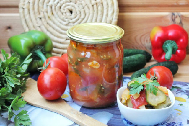 En combinación con pepinos, puede encurtir otras verduras. Los tomates, pimientos morrones y cebollas son los más adecuados para este propósito. Las especias y hierbas deben agregarse a la composición de ensaladas y cortes a su discreción. El eneldo, la albahaca, el ajo y la pimienta negra dan un aroma inusual a tales espacios en blanco.