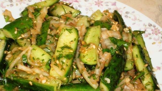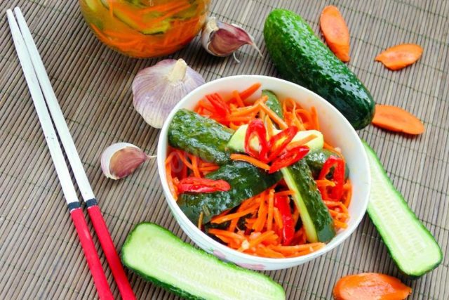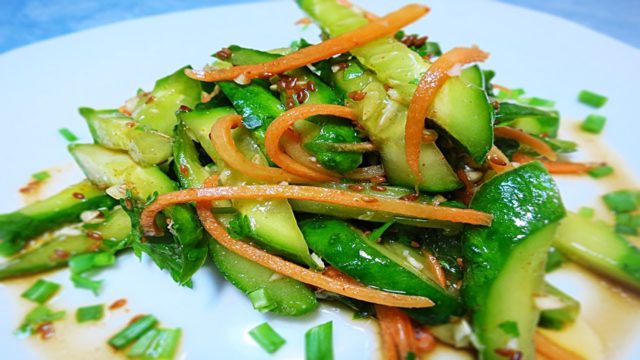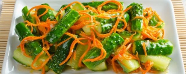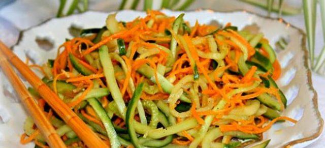 En un corto período de tiempo, puede preparar una ensalada oriental simple e inusual si corta los ingredientes con anticipación y los coloca en un recipiente. Luego, cuando necesite servir un bocadillo a los invitados, puede obtener verduras precortadas y combinarlas con especias. Déjelo reposar durante 5 minutos. Los pepinos listos para usar son el complemento perfecto para puré de papas, cereales, embutidos o pescado.