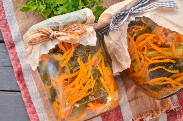 Los pimientos agregan dulzura adicional al refrigerio, mientras que las zanahorias agregan jugosidad. A muchos les gustarán estos pepinos por el juego de contrastes de sabor. Qué necesita estar preparado: