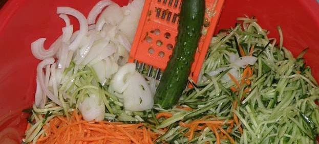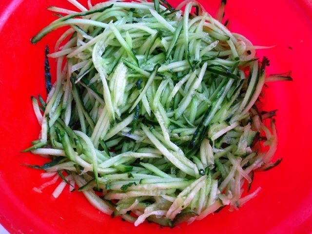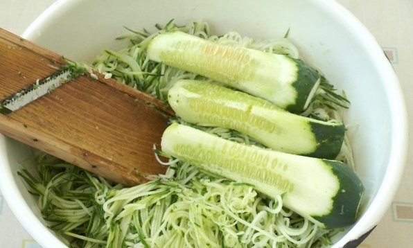Puede tomar frutas de cualquier forma y tamaño. Incluso los que crecen demasiado son adecuados. Lo mejor es rallar las verduras con un rallador de zanahoria al estilo coreano, pero si no está, puedes usar el grande habitual. Para que las frutas comiencen a jugo rápidamente, primero se sala y luego se amasa con las manos.