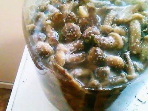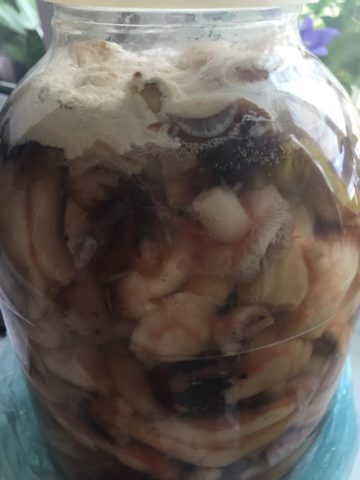 Después de salar los hongos, a veces aparece una flor blanca en la superficie del frasco. Esto no es moho, sino levadura kahm, no son dañinos para la salud. Si la tapa no cierra bien el frasco, la salmuera o el adobo se evapora y la superficie de los hongos se cubre con una flor blanca.