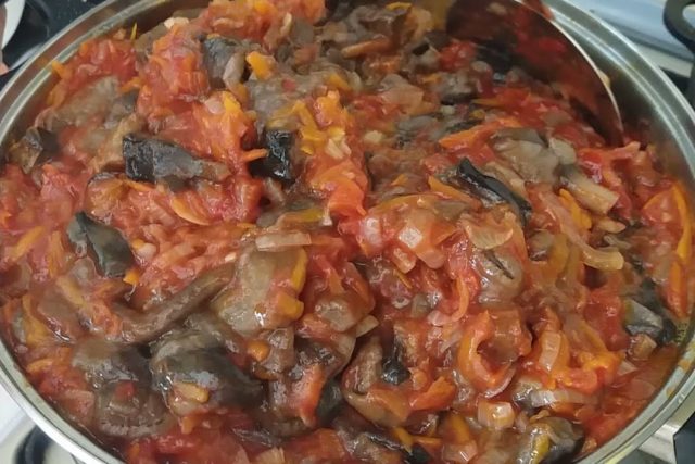 - Vierta el tomate en un recipiente esmaltado o de acero inoxidable, agregue aceite y cocine durante 7-10 minutos, revolviendo y desnatando.