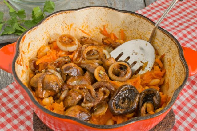 - En un bol de fondo grueso, cocine a fuego lento todos los ingredientes en aceite: primero la cebolla, luego las zanahorias y las setas con miel.