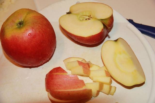 - Manzanas agridulces (4 piezas) Debe pelar y quitar las vainas de semillas. Lo mejor es cortar las manzanas en 4 trozos.