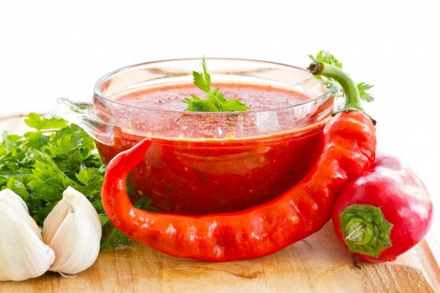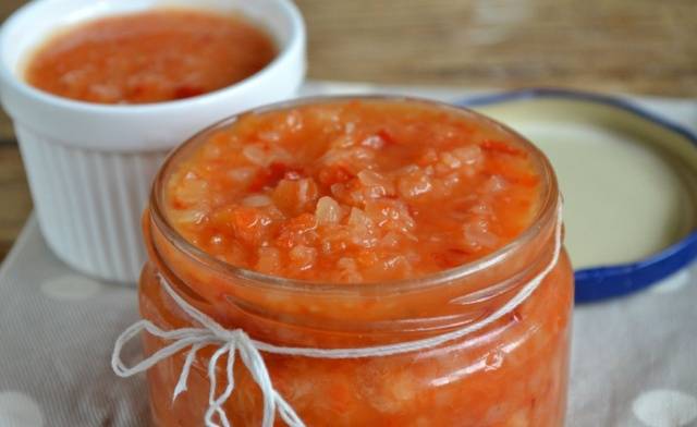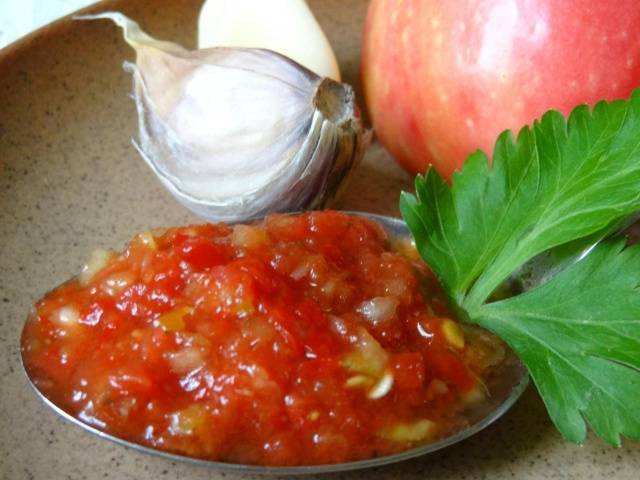 La adjika sin ajo para el invierno se prepara agregando tomates, Rábano picante, pimiento. Dependiendo de la receta, la lista de componentes y el orden de preparación pueden variar. Con rábano picante, puede agregar especias a la salsa. Adjika resulta ser más dulce, donde están presentes manzanas, calabacines o berenjenas.