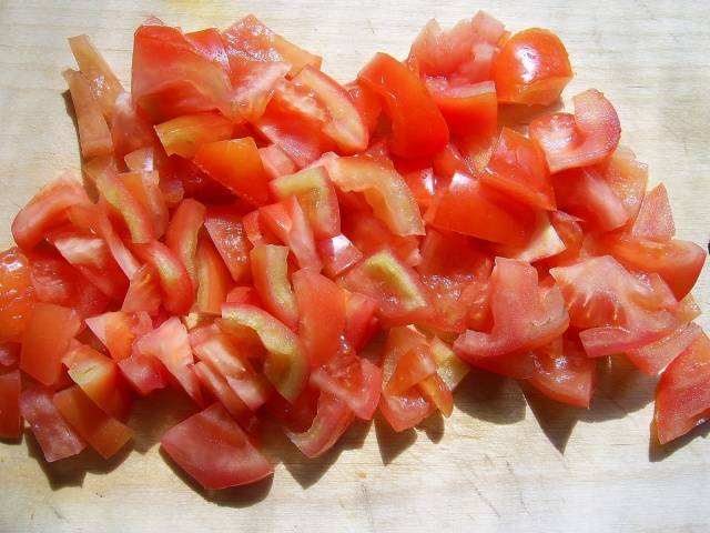 - Los pimientos dulces se cortan en trozos pequeños, los tomates se pueden cortar arbitrariamente. Chiles (2 uds.) Cortados en aros.
