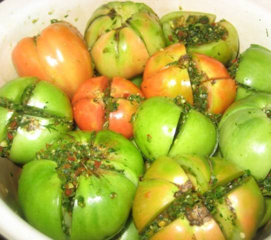 Se preparan varios tipos de bocadillos a partir de tomates verdes para el invierno. Las verduras se pueden marinar en salmuera o hervir a fuego lento. Un aperitivo a base de tomates rellenos de hierbas parece original. La guarnición terminada se obtiene de tomates verdes y otras verduras, enlatadas con arroz.