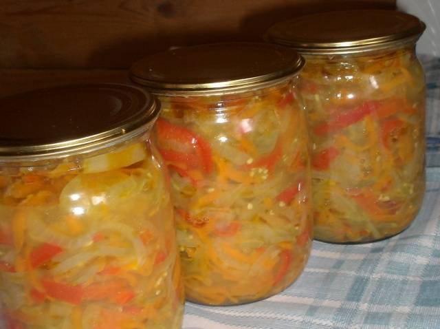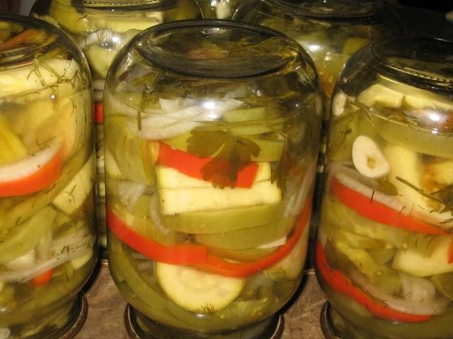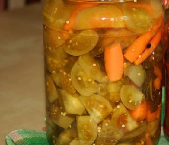 Se puede obtener un refrigerio de invierno de tomates verdes marinándolos con calabacín, pimientos y otras verduras. El procedimiento de cocción toma la siguiente forma: