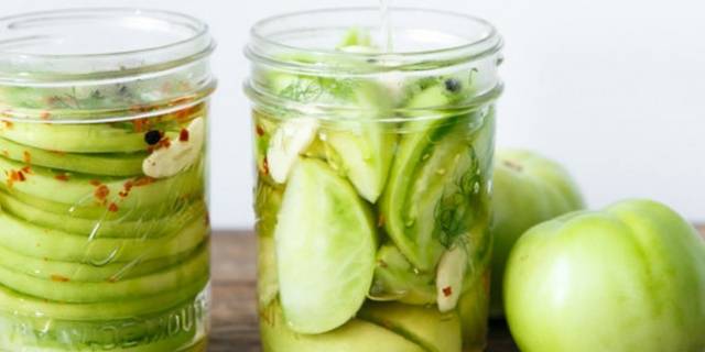El aperitivo de tomate verde se obtiene encurtiendo verduras, que se cortan en trozos y se vierten con adobo. Los tomates se encurten enteros, se cortan en trozos o se rellenan con ajo y hierbas. Otra opción para obtener un bocadillo de verduras es calentar todos los componentes. Para el almacenamiento a largo plazo, se recomienda agregar un poco de vinagre al refrigerio.