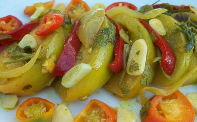 Un aperitivo picante se hace con tomates verdes, a los que se les agrega cilantro y pimienta chilena. El procedimiento para su obtención consta de determinadas etapas: