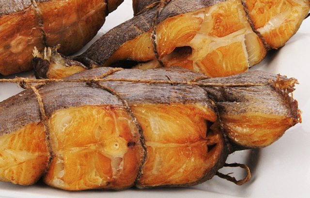 Las canales se cortan en tiras de 7-8 cm y se frotan con una mezcla de sal y azúcar. La salazón dura de 2 a 3 días, después de lo cual el pescado se quita la sal y se seca ligeramente. Se añaden pieles de cebolla a 2 litros de agua y se prenden fuego. Tan pronto como el líquido hierva, se coloca el pescado durante 10 minutos. Hierva durante 5 minutos, luego sáquelo del agua y límpielo con una toalla de papel. Los cadáveres se untan con humo líquido y se cuelgan en el balcón durante 1-2 días.