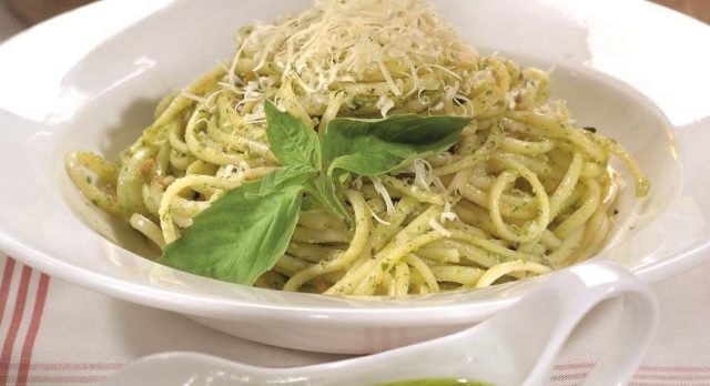 La albahaca en forma de pasta, sin aditivos, se puede utilizar como salsa para espaguetis, pastas y arroz. Agregar unas cucharadas de la mezcla antes del final del hervor agregará sabor a los primeros platos. Esta cualidad es especialmente apreciada en la preparación de sopas de puré que no difieren en sabor pronunciado.