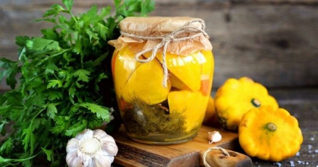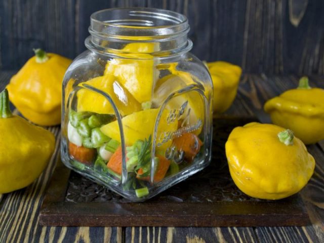 - Los Patisson se colocan en bancos preesterilizados. Vierta la marinada restante para que su nivel esté 2 cm por debajo del cuello. Cubrir con tapas y meter en un horno precalentado a 150 ° C. Tan pronto como el contenido de los frascos comience a hervir, déjelo por otros 5 minutos. Saque los recipientes y atornille bien las tapas.