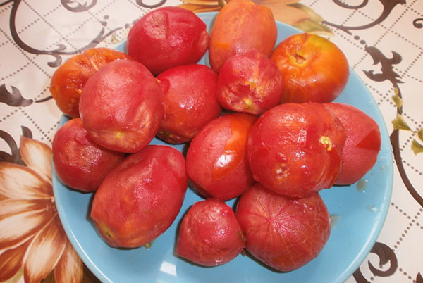 Los tomates se lavan a fondo para evitar la contaminación, se quitan los tallos y se secan ligeramente. Luego, en el reverso del tallo, se hace un corte de piel en forma de cruz en cada tomate.