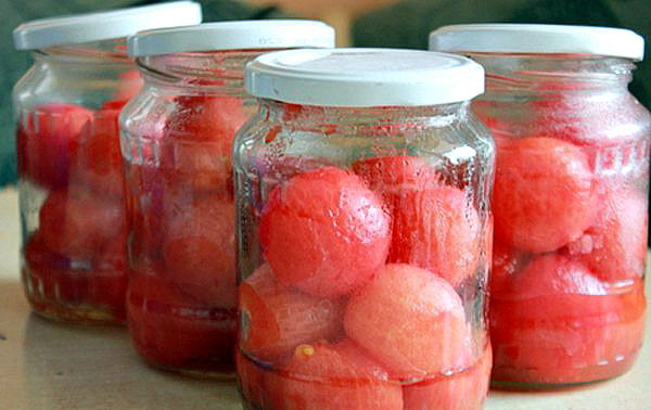 Puede prescindir de la esterilización, pero esto requerirá la adición de vinagre o el calentamiento adicional de los tomates en un frasco. Si se utilizan frutas peladas, esto puede afectar negativamente a su apariencia. Por lo tanto, si se realiza el calentamiento por calor para los tomates pelados, solo una vez para que los tomates pelados no se conviertan en papilla.