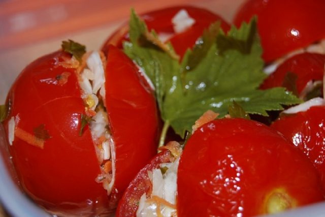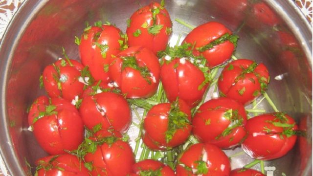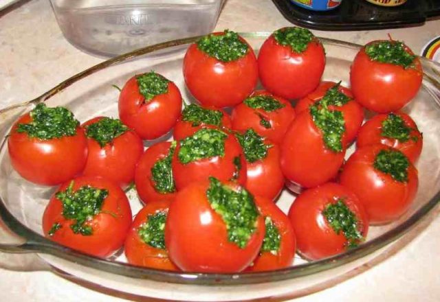 - Tome una cacerola grande, ponga pimiento picante, raíz de rábano picante en el fondo, una capa de tomates rellenos en la parte superior, luego hierbas y ajo (picado).