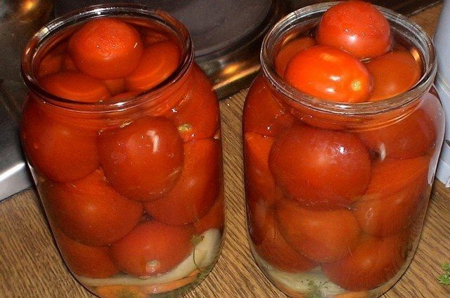 - escurriendo el agua enfriada, vierta inmediatamente la marinada hirviendo en frascos de tomates y apriételos instantáneamente con tapas para conservar para el invierno;