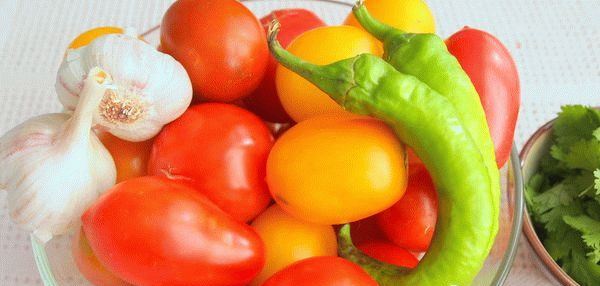 En la variedad existente de preparaciones de tomate para el invierno, las recetas georgianas siempre se distinguen por la abundancia y variedad de hierbas incluidas en los platos, así como por la presencia obligatoria de componentes que agregan especias a los platos: pimiento picante o ajo, o ambos. al mismo tiempo.