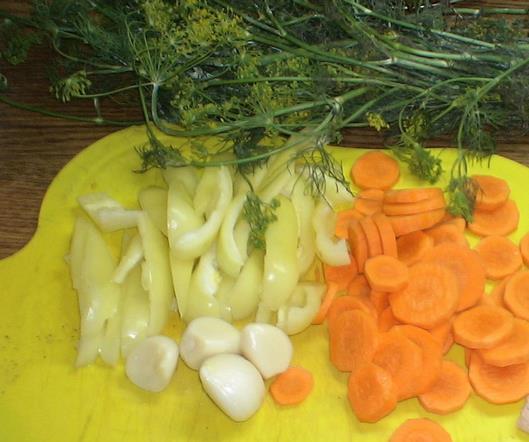 - Por primera vez, las verduras preparadas de acuerdo con la receta se vierten con agua hirviendo hasta el cuello (se permite que el agua se desborde incluso ligeramente).