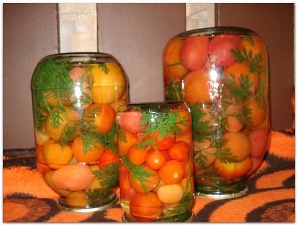 Tomates en escabeche con puntas de zanahoria, eneldo y ajo