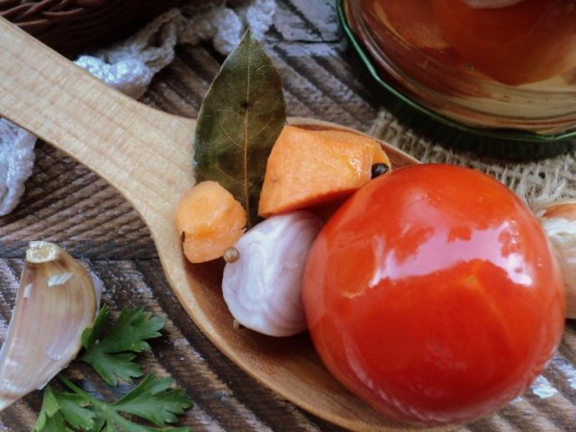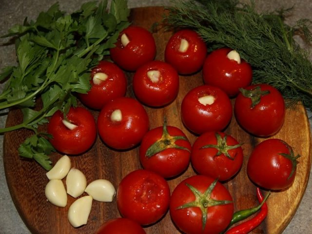 Los tomates marinados con ajo y apio son una de las recetas del toque invernal de las verduras favoritas de todos, que agregarán variedad a cualquier menú. Según esta receta, las verduras son muy aromáticas, despiertan instantáneamente el apetito. Adecuado no solo para las comidas diarias, sino también para las delicias festivas.