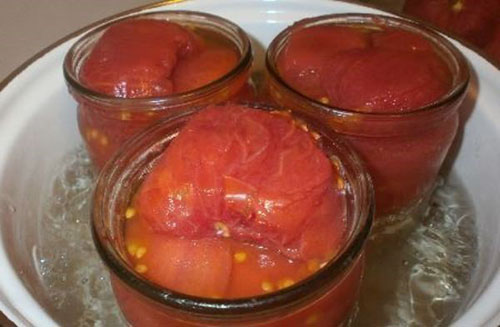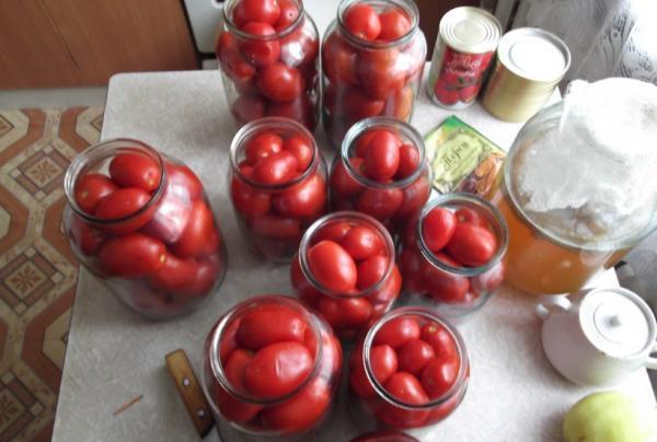 - Los frascos esterilizados se llenan con tomates densos seleccionados y lavados a fondo (con o sin piel a su discreción).