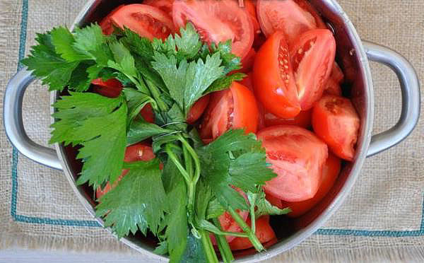 Actúan exactamente de la misma manera al hacer tomates en su propio jugo con apio. Este último sirve principalmente para condimentar salsa de tomate hecha a base de pasta. Un manojo de apio de 4-5 ramitas, atado con un hilo, se coloca en pasta de tomate diluida mientras se calienta. Antes de verter los tomates en frascos, se retira el apio del recipiente.