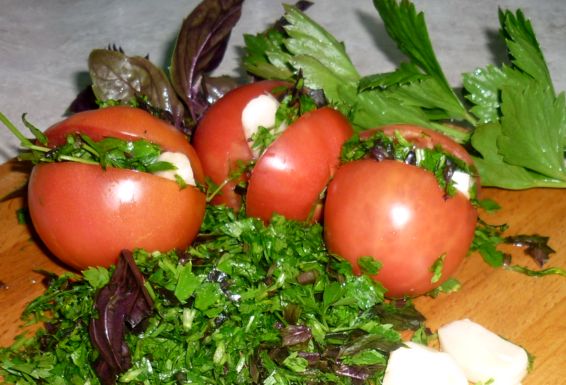 - 11 Tomates rellenos de ajo y hierbas, bañados en jugo de tomate