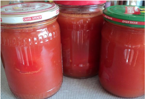 Una bebida de tomate en sí misma es un buen conservante y, por lo tanto, con el debido cumplimiento de la tecnología, no se puede usar vinagre. Los ingredientes son los mismos: tomates, sal, azúcar, granos de pimienta picante.