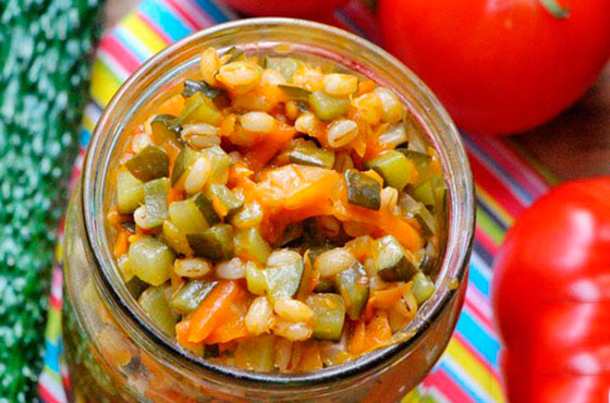La base de la cosecha de invierno son los pepinos, los tomates y la cebada perlada. Los pepinillos se utilizan no solo frescos, sino también salados. Están rallados o finamente picados. El método de preparación depende directamente de la receta seleccionada. Luego, el producto procesado se deja durante varias horas para que suelte más jugo, que luego se escurre por completo. Primero se quita la piel de los tomates. En este caso, el pepinillo resultará más tierno. Los tomates se tuercen con mayor frecuencia en una picadora de carne o se cortan finamente.