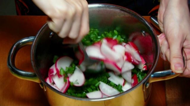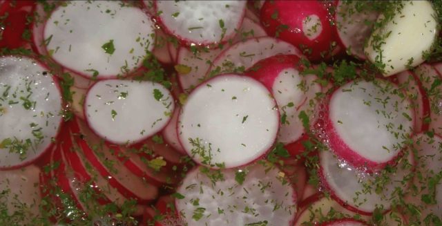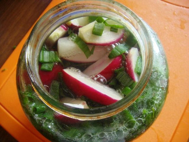 La verdura se corta en rodajas finas y se coloca en frascos de vidrio preesterilizados. Es importante recordar la secuencia: primero una capa de rábanos, luego una capa de hierbas y ajo finamente picados.Además del perejil y el eneldo, se agrega cilantro u otras hierbas al gusto, según las preferencias de gusto del chef.