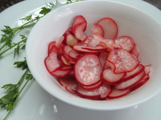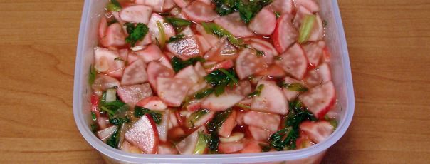 La salazón sigue siendo el método de cocción más popular. Como plato independiente, y en combinación con la versión clásica de la preparación, con pepinos y tomates, la verdura de raíz no se perderá en la mesa del comedor. Las amas de casa experimentadas han aprendido a fermentar rábanos en su propio jugo. El plato resulta inusual y muy sabroso.